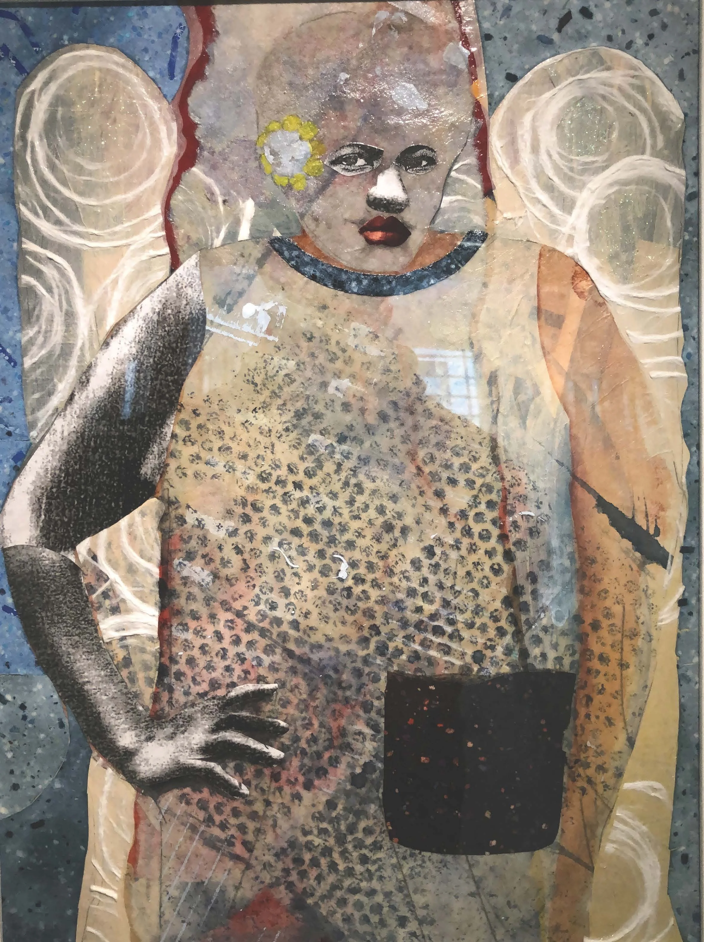“Angel of Mercy” Handmade paper photo collage on paint board 24’ X 18” 2019. The “Angels” works are directly from my “Women I Know” works. My grandmothers encouraged me each in their own way. My teachers, most of which were women, pointed me in the right direction. And then there were my mother and my sisters, who seemed to expect more from me. So, I paint them here as angels. I will likely have several more images depicting angels because there are many more that influenced my trajectory.